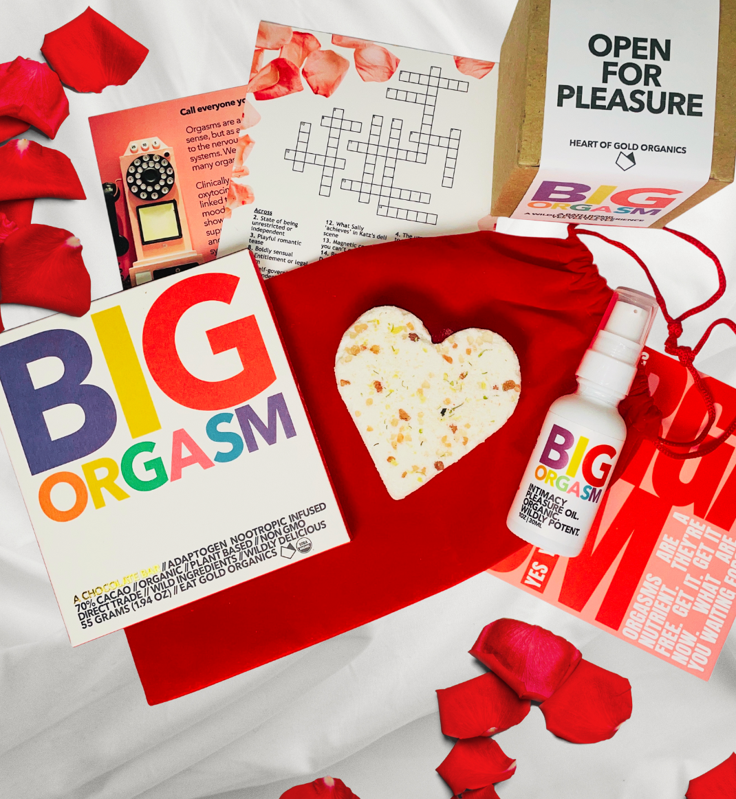 Our curated bundle includes our best-selling, irresistibly delicious organic chocolate bar, a bottle of the most potent intimacy oil available, and a luxuriously indulgent bath bomb. Plus, as a playful bonus, enjoy our cheeky wisdom and a fun, flirty crossword to spark your curiosity.